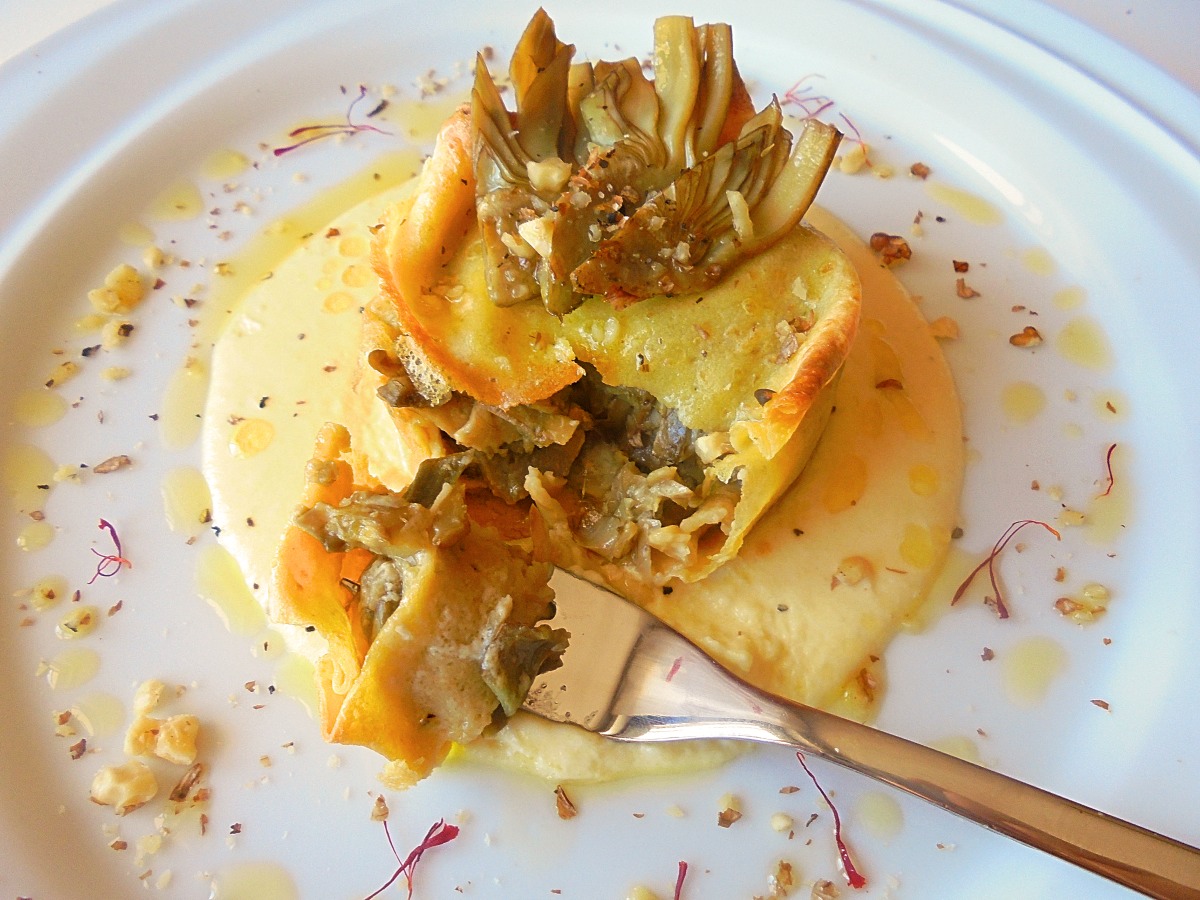Qui l’ho preparato con dei carciofi romaneschi e della burrata, ingrediente che si presta benissimo ad amalgamare la farcia; ho poi aggiunto delle noci tritate. Il tutto servito con della crema di pecorino romano e zafferano di Navelli.